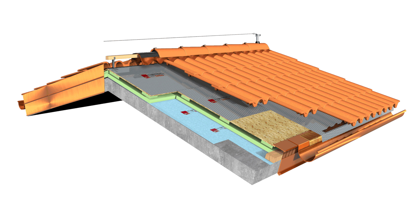 Pacchetto di copertura composto da un freno vapore impermeabilizzante ed altamente traspirante  , con tessuto non tessuto nella parte sottostante per il recupero ed il trasferimento in grondaia di eventuali condense in arrivo dagli ambienti sottostanti. Pannelli Sandwich  formati da un isolante termico ad alta densità e traspirabilità, da una camera d’aria  per la ventilazione che consente lo smaltimento del calore della copertura e da un piano di posa in lastra di legno fenolico OSB  per la posa delle tegole o dei coppi migliorando ulteriormente il confort abitativo sia d’estate che d’inverno; permette agli ambienti sottostanti di abbassare maggiormente la temperatura interna d’estate e di mantenere più a lungo il calore d’inverno. Impermeabilizzazione sottotegola o coppo con una seconda membrana impermeabilizzante altamente traspirante e riflettente  , sviluppata specificatamente per i tetti, dalle notevoli doti di resistenza meccanica, stabilizzata ai raggi UV, antiscivolo ed antiriflesso; la capacità di traspirazione consente al tetto di eliminare eventuali residui di umidità. Lo strato metallizzato riflettente respinge fino al 60% del calore emesso sottoforma di raggi infrarossi dalle tegole o dai dai coppi riscaldati dal sole e riduce del 20% il calore in arrivo dalla copertura ottenendo così un risparmio del 30% dell’energia annuale utilizzata in riscaldamento e/o condizionamento. Frontalino forato  sottogrondaia per il passaggio dell’aria all’interno della camera di ventilazione. Manto di copertura formato da tegole o coppi  , microventilazione tramite griglie parapassero metalliche  sottocolmo ventilato .